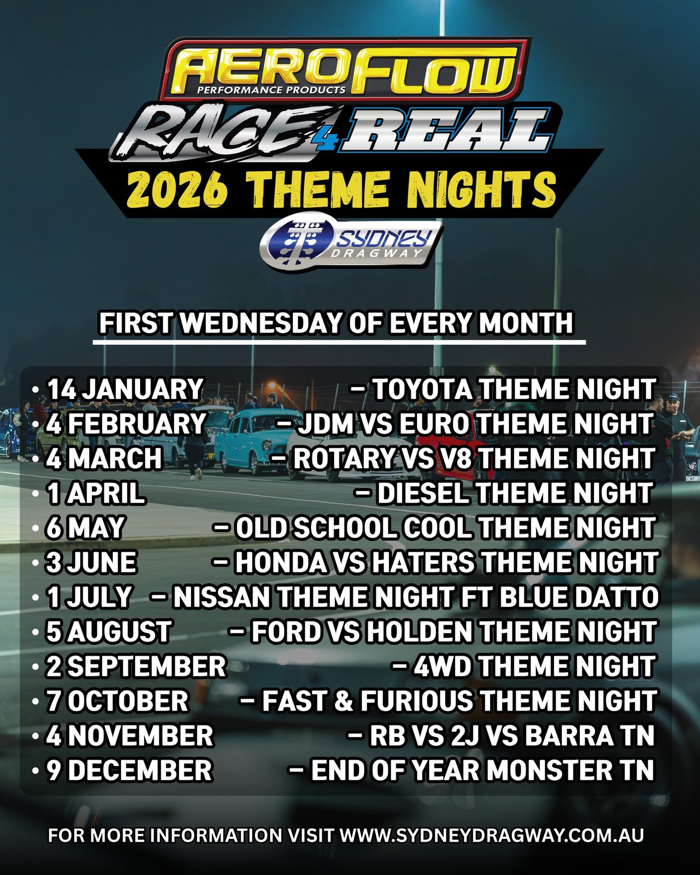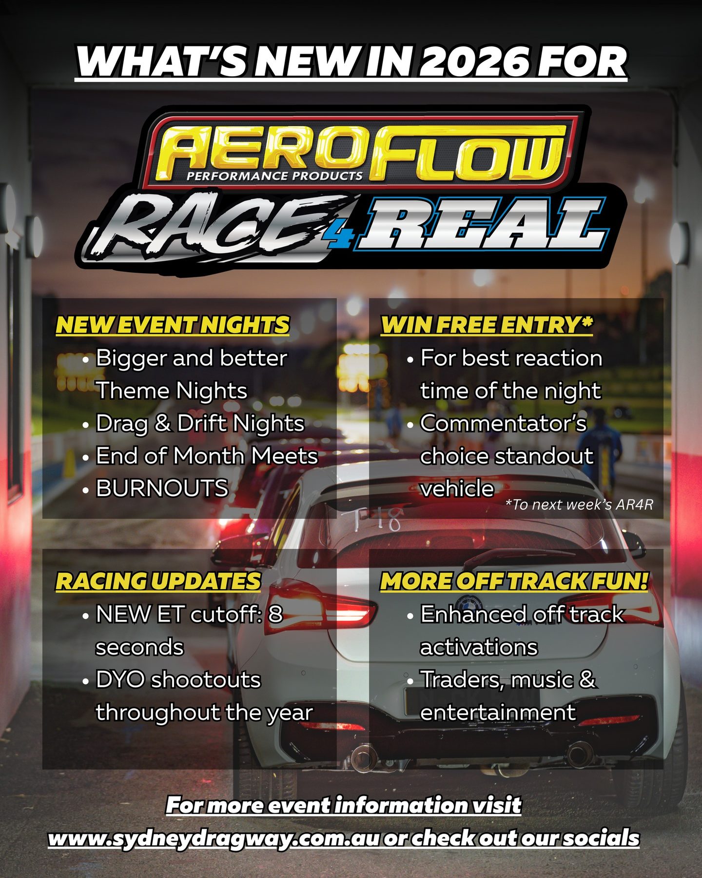 Have you ever wanted to test the performance of your street car or bike, but didn’t know the safest way to do it? You need Aeroflow Race 4 Real at Sydney Dragway each and every Wednesday night (weather permitting). Race yourself! Race your Mates! Race for fun.